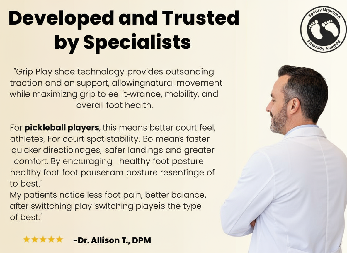 Grip Play shoes feature advanced non-slip soles and wide, supportive designs that improve your balance and protect your joints, helping you play longer and stronger without discomfort.